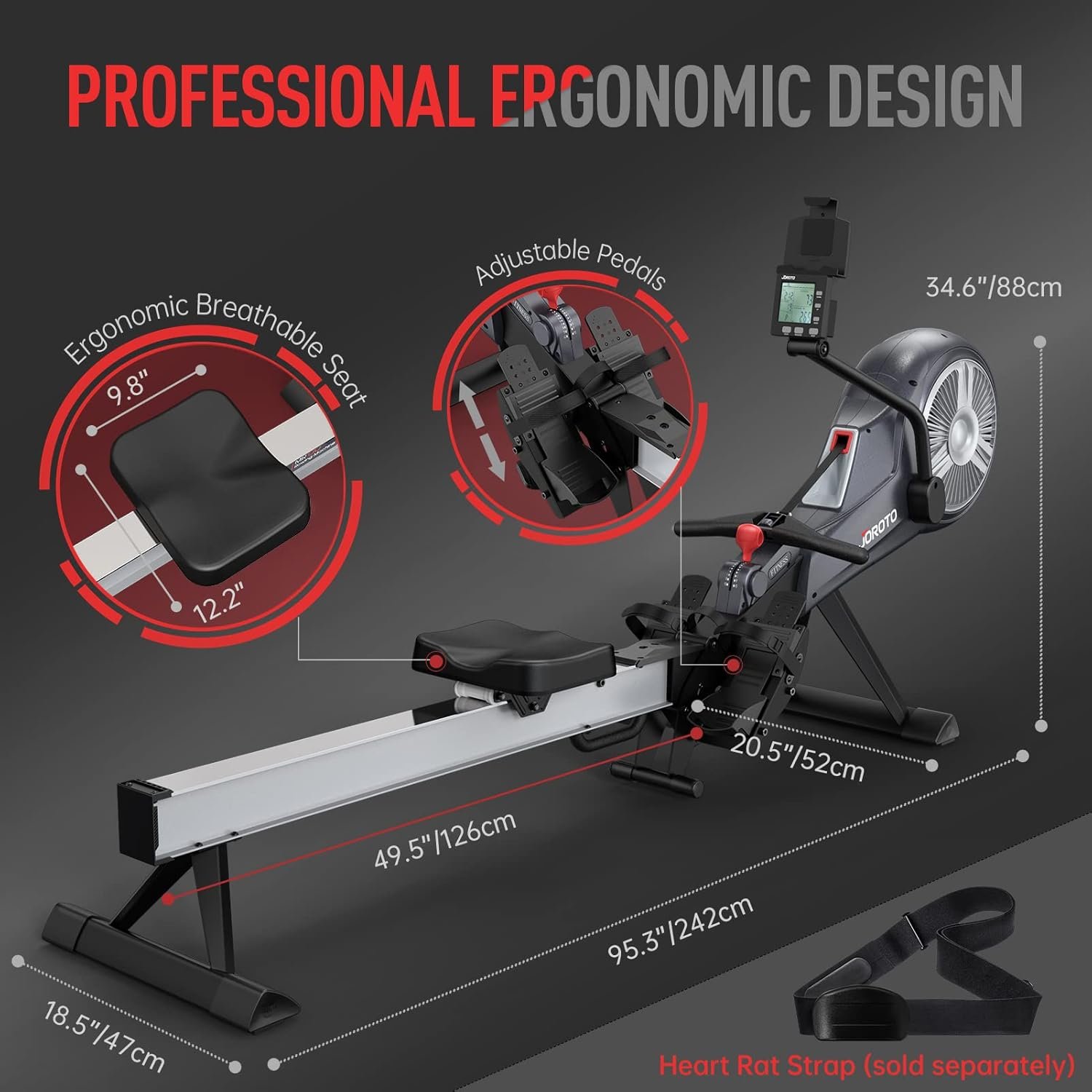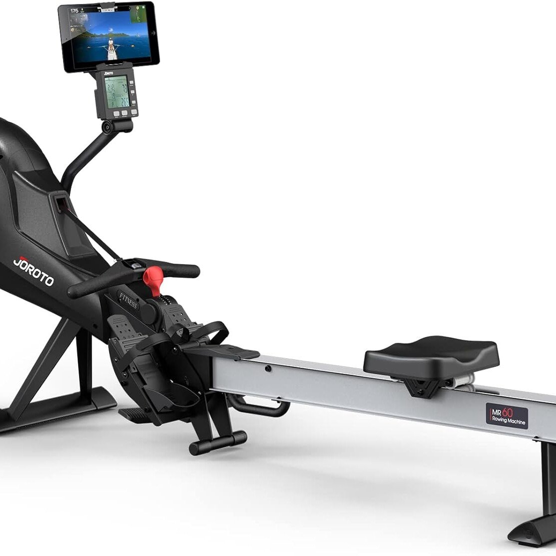 JOROTO Rowing Machine, Air Magnetic Foldable Rowing Machines for Home Use, Rower Machine with 49.5″ Rail, Backlit Monitor, Bluetooth, App Supported, Tablet Holder