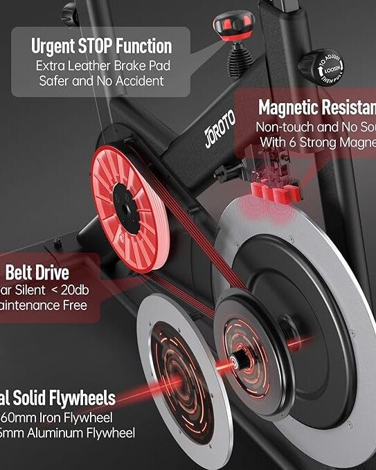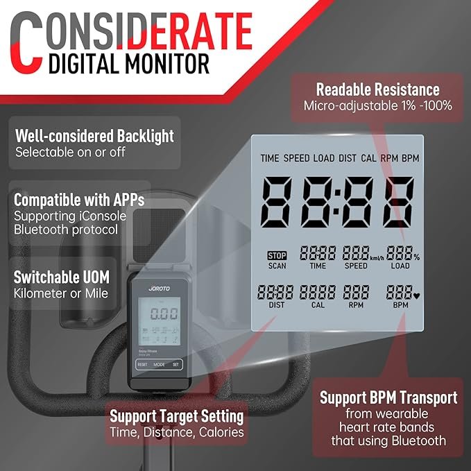 The JOROTO X2PRO offers a smooth indoor cycling experience with 100 levels of magnetic resistance, Bluetooth connectivity, and a 12.6-inch tablet holder. Its robust magnetic frame and added safety brake pads make it ideal for home workouts.