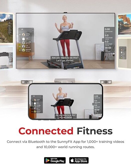 2. 【CONNECTED FITNESS】Sync this treadmill with your smart devices via Bluetooth and the FREE SunnyFit app. Gain access to over 1,000 workouts and 10,000+ scenic global running routes. Personalize your training and track your progress in real-time as you run.