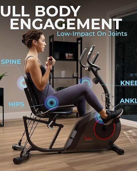 - 【SMART RECUMBENT BIKE FOR LOW-IMPACT FITNESS】This joint-friendly bike, compatible with the SunnyFit app, is ideal for low-impact workouts, especially for seniors. The cushioned, adjustable seat maximizes comfort, and built-in resistance bands provide options for upper body exercise.