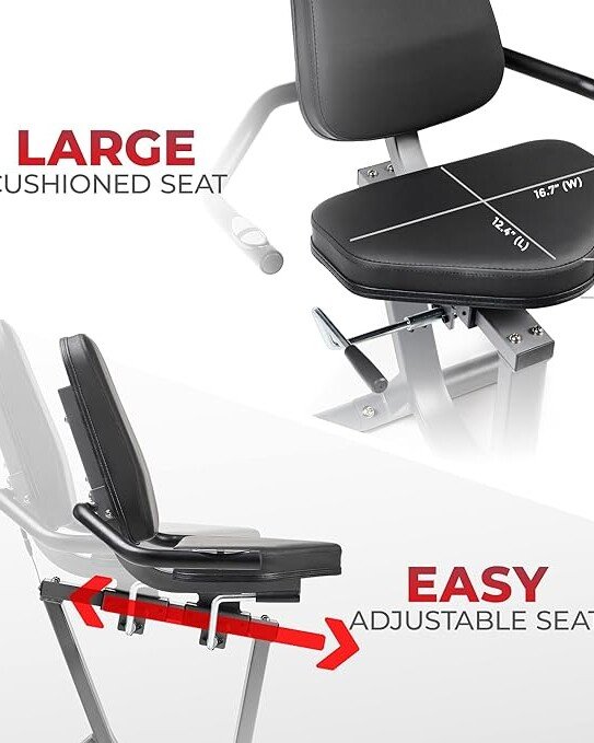- COMFORTABLE RIDE: The large, cushioned, and easily adjustable seat provides comfort throughout each workout. Enjoy the non-slip handlebar and textured foot plates to keep your grip and feet firmly in place, so you don’t have to deal with constantly re-adjusting.