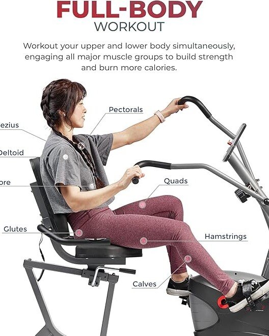Sunny Health & Fitness Smart Recumbent Bike, Full-Body Home Training with Arm/Leg Exercisers, Indoor Cycling Workout Machine Plus Adjustable Seat & Bulit-in Pulse Sensors, Free SunnyFit App Connection
