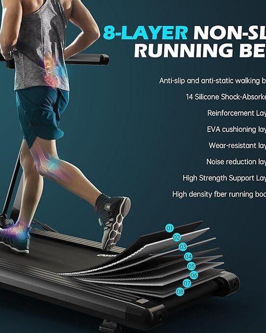 - 🏃【 Dual Float Shock Absorption System & Anti-slip Tread Belt】Treadmill Home with 14 point shock absorption to relieve the stress of knees, Treadmill has a 8-layer tread belt, and built with a high-density lawn texture belt that absorbs shock for premium comfort with the non-slip feature, provides you with a strong cushioning effect and protects your knees, ankles, waist and neck joints, making your exercise safer and more comfortable.
