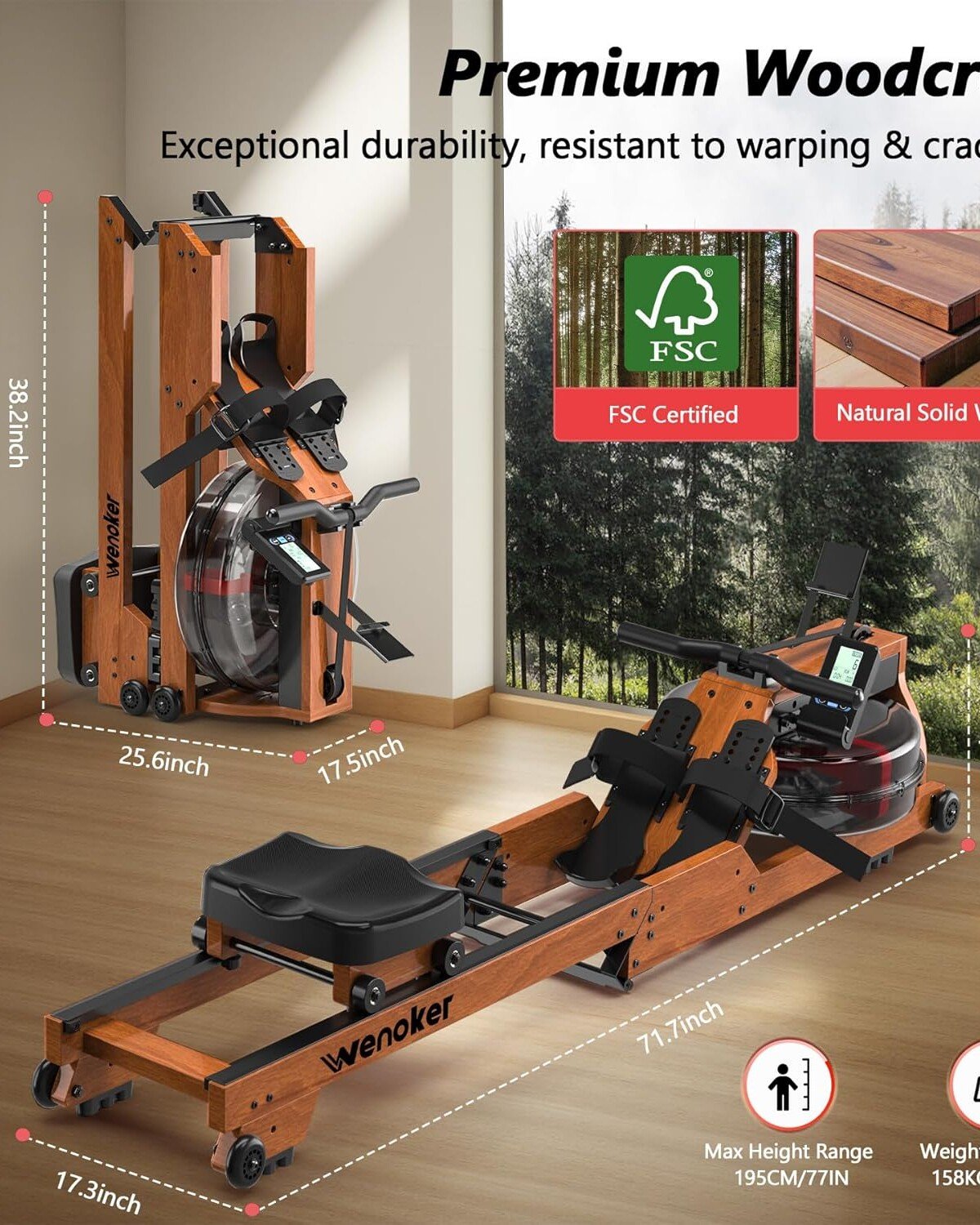 - [Premium Solid Build] The water rower are made of FSC-certified premium solid wood, which has excellent durability and stability to support 350lbs/158kg max load. Accommodating users up to 77 inches tall, it’s the perfect fit for nearly every member of your family.